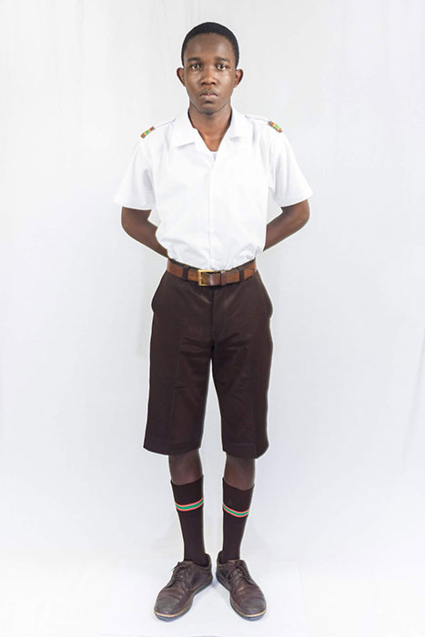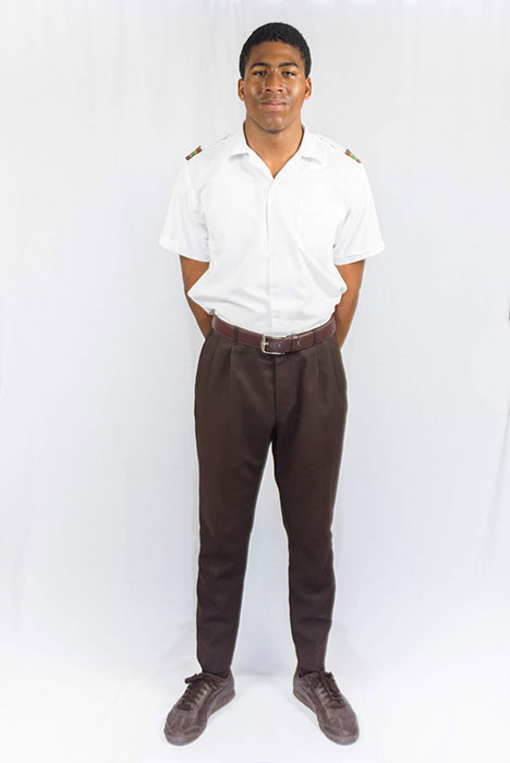 Long brown pants. White short-sleeved shirt with school epaulettes. Plain brown belt, brown socks and brown shoes.