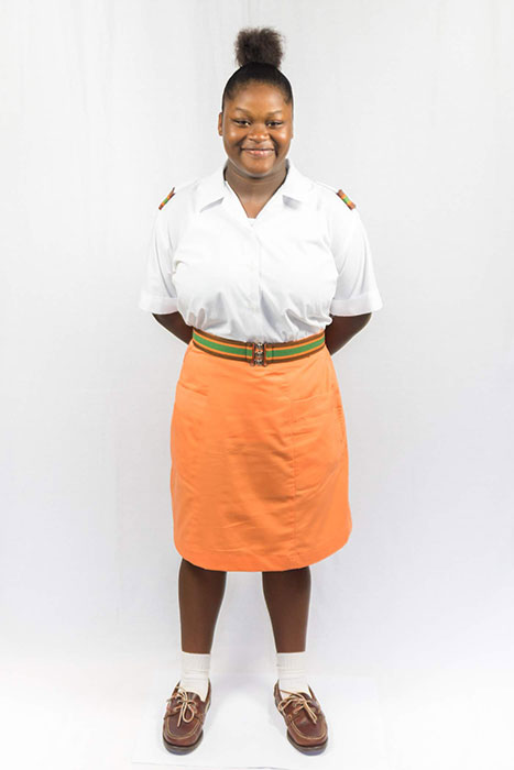 White blouse and peach skirt with school epaulettes and belt, white socks and brown shoes.