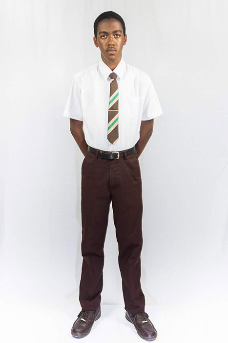 Long brown pants. White short-sleeved shirt with school tie. Plain brown belt, brown socks and brown shoes.